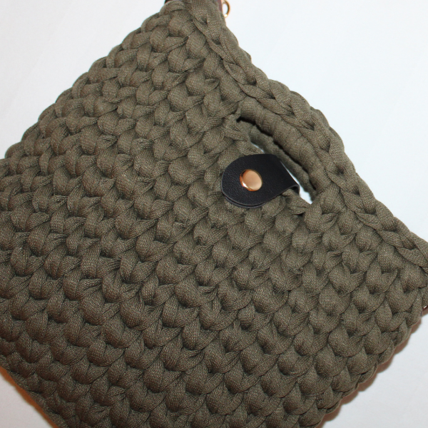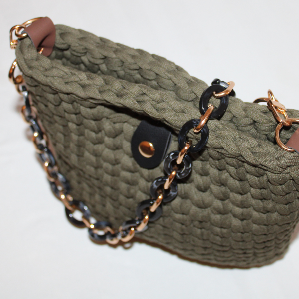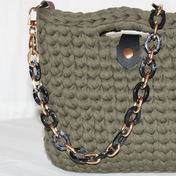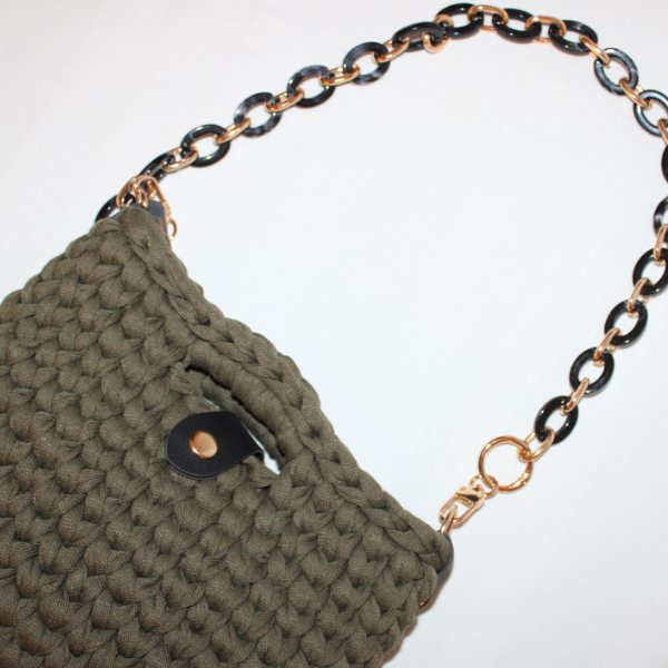 Descripción: Bolso rectangular que se cuelga al hombro con cadena acrílica. Se cierra con un cierre de polipiel y botón de imán. Está realizado a mano con trapillo pluma. El bolso no pesa.