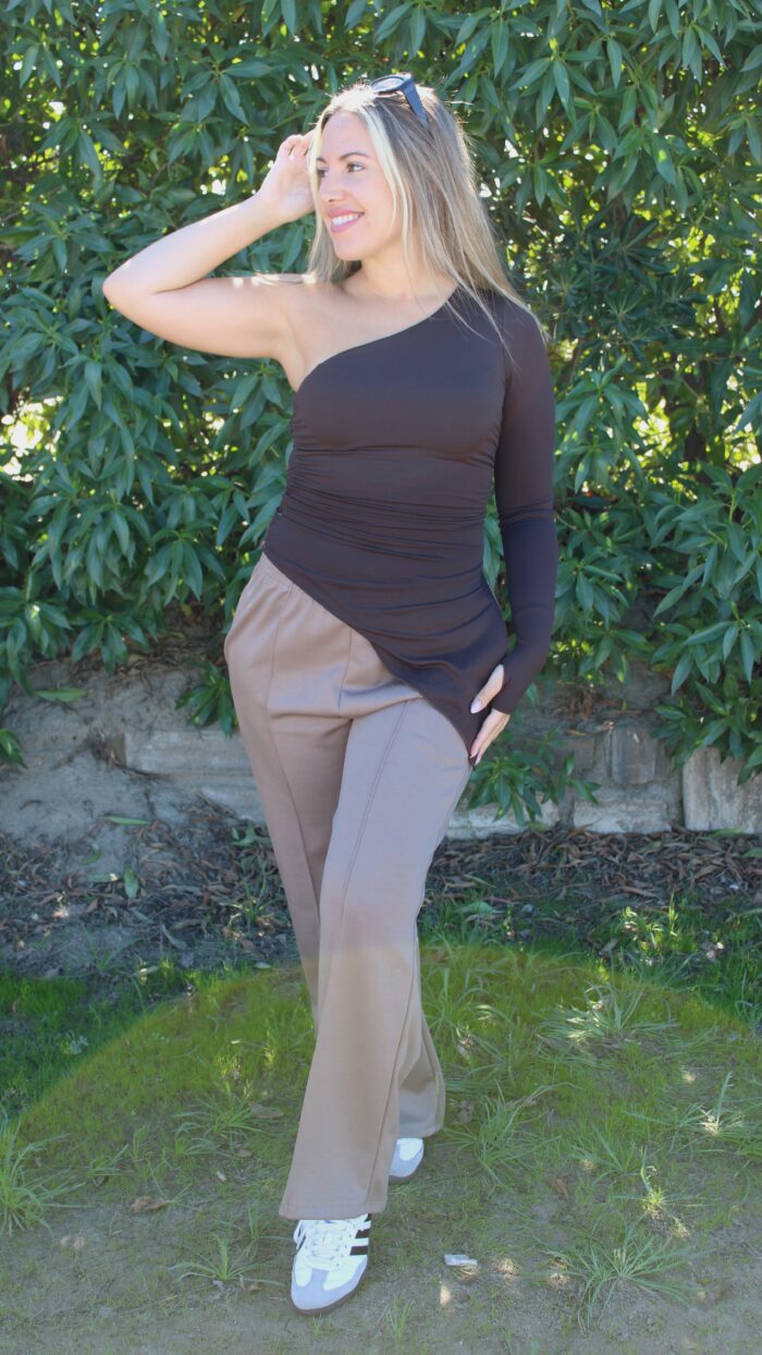 Descripción: Camiseta asimétrica de lycra en color marrón. La manga tiene para introducir el dedo pulgar.