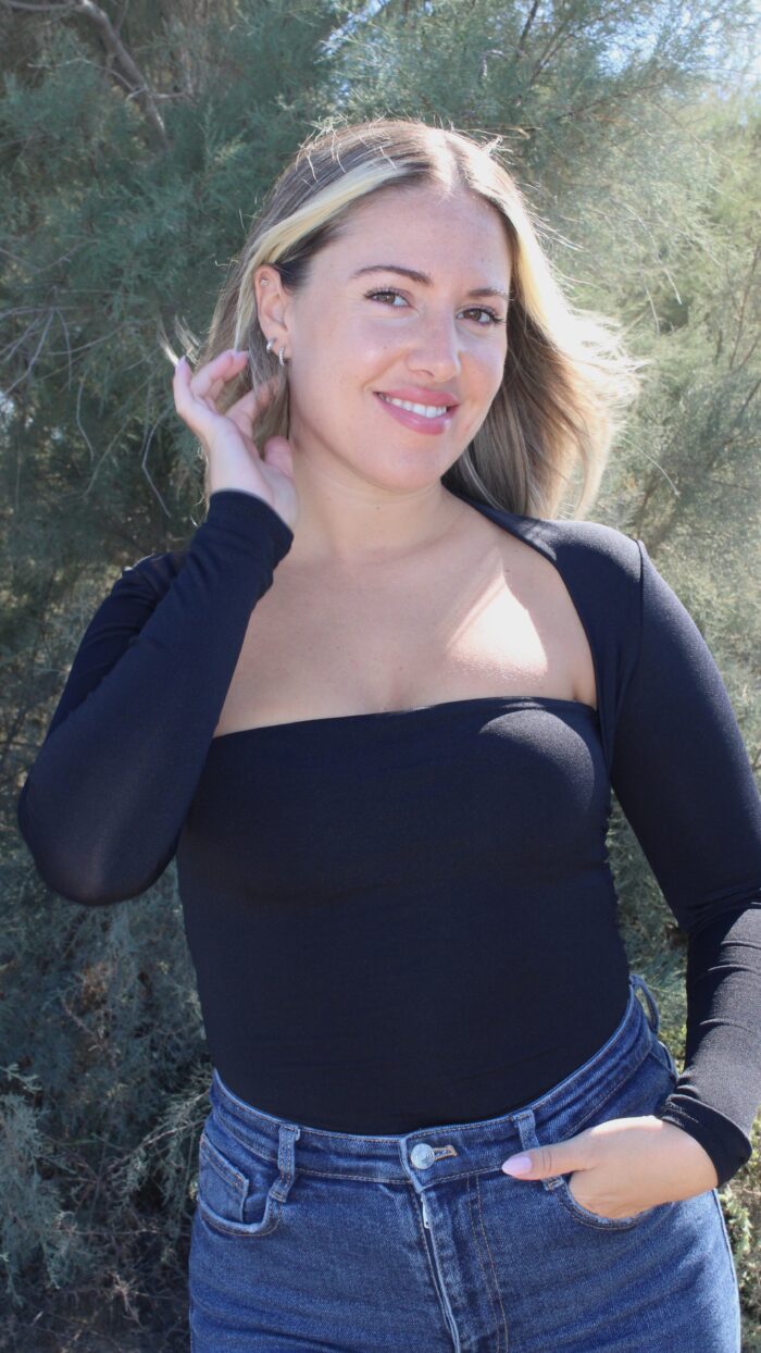 Descripción: Camiseta de escote cuadrado y mangas largas. La tela es lycra, por lo que se ajusta al cuerpo.